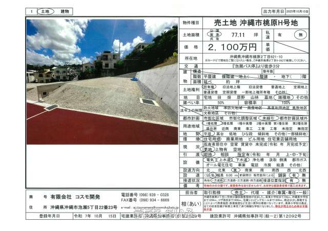 最終価格値下げしました♪沖縄市桃原2丁目に新設造成工事が完成しました♪全12区画中、残り1区画分譲で、77.11坪の住宅用宅地分譲です。人気の美東小学校まで600mの距離です。美東小学校は最近、校舎・体育館・運動場も全て新築し、とても綺麗な小学校になりました。隣接する幼稚園も同様です。周辺環境も良好で、サンエー・ユニオン等買い物も便利で医療施設も大変充実した環境です!また、建築条件付きではありませんので、お好きな建設業者様で建築可能です。皆様からのお問い合わせお待ちしております(*^_^*)※弊社売主のため仲介手数料は発生いたしません♪最終販売地H号地77.11坪2,100万円 残り1区画の販売となります。