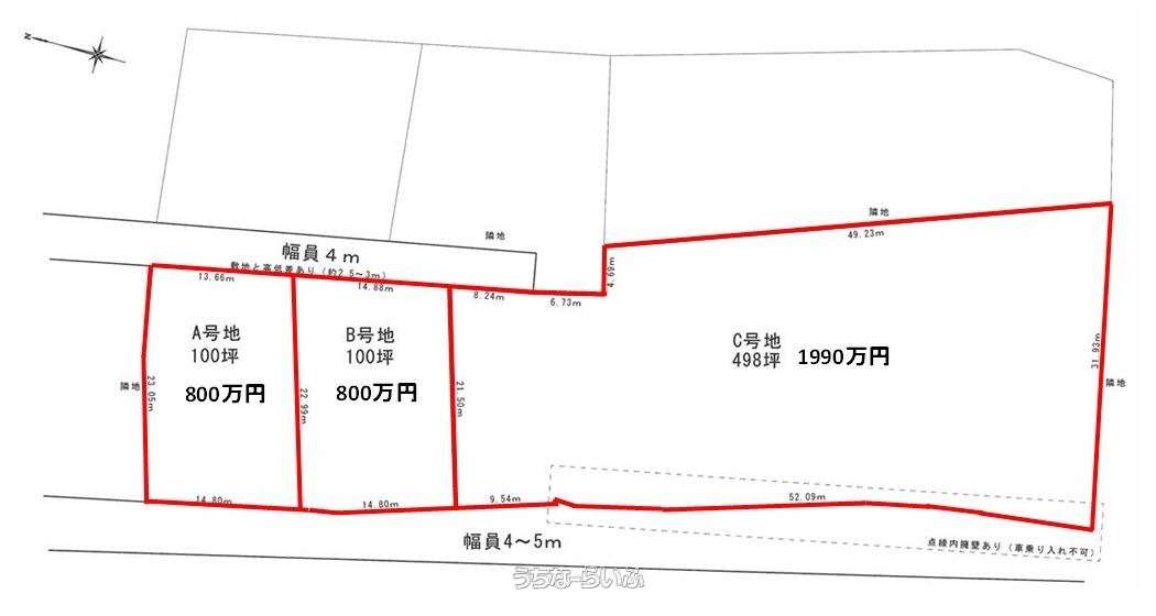 | 価格備考 | ※一括698坪3590万円 ※A号地100坪800万円 ※B号地100坪800万円 ※C号地498坪1990万円 | ||