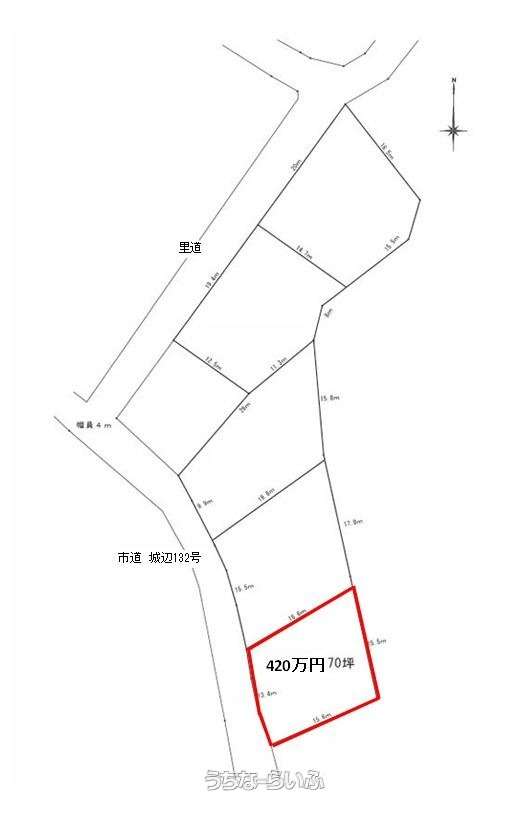 | 用途地域 | 無指定 | 接道方向 / 道路幅員 | 南西4m、 北西4.2m |
