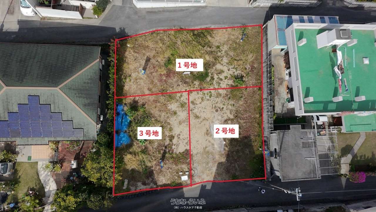 | 価格備考 | 1号地 149.74㎡ 1898万円 2号地 149.74㎡ 1898万円 3号地 149.75㎡ 1698万円 3区画 一括販売 449.23㎡ 5398万円 | ||