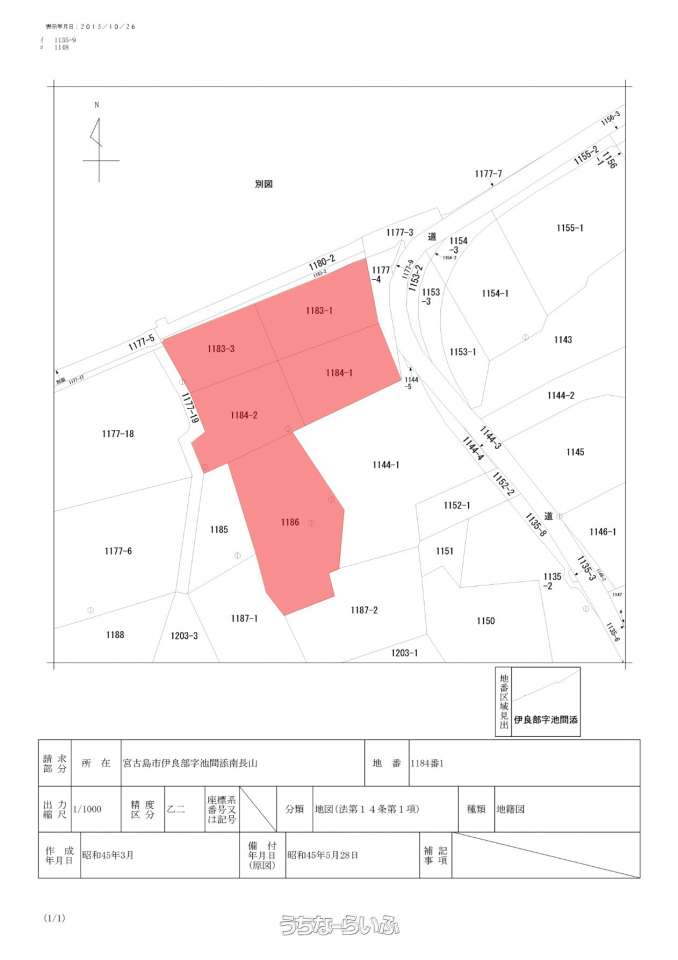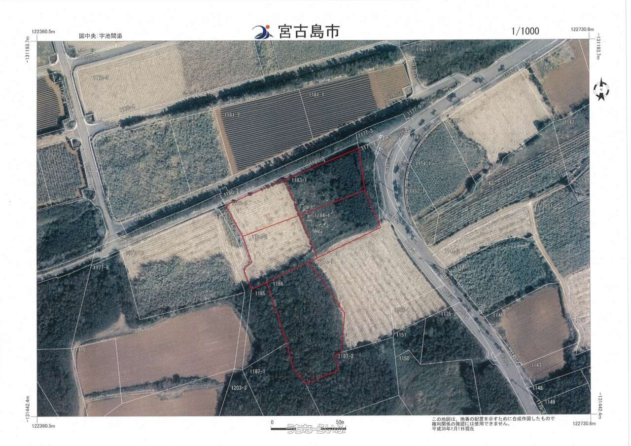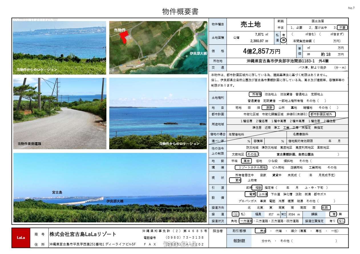 | 備考 | ・本物件は、都市計画区域外に存している為、建築基準法に基づく制限はありません。但し、伊良部県立自然公園及び宮古島市景観計画に存している為、高さ及び建蔽率、容積率等の制限があります。 ・北側隣接道路幅員約7m。東側隣接道路には給水管200mmが埋設されています。 |