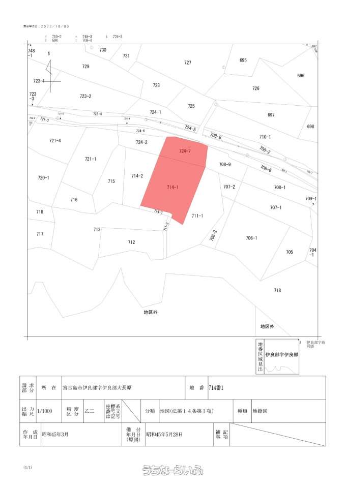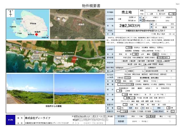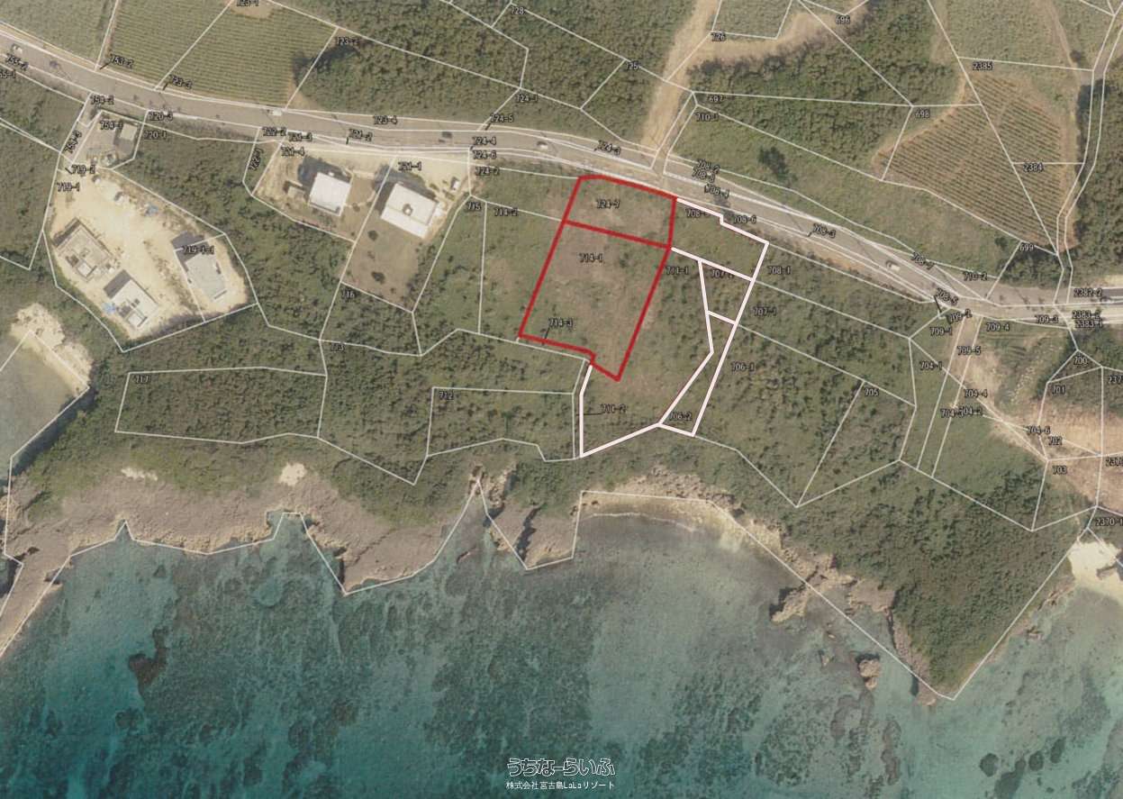 | 備考 | ・本物件は、都市計画区域外に存している為、建築基準法に基づく制限はありません。但し、伊良部県立自然公園及び宮古島市景観計画に存している為、高さ及び建蔽率、容積率等の制限があります。 ・北側隣接道路幅員約10m。及び給水管150mmが埋設されています。 |