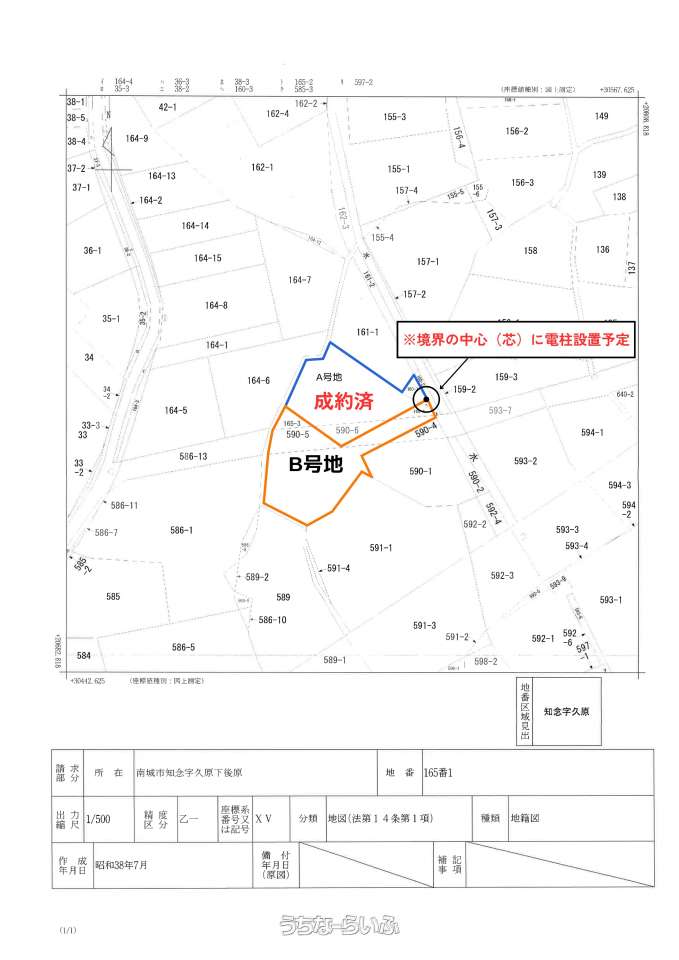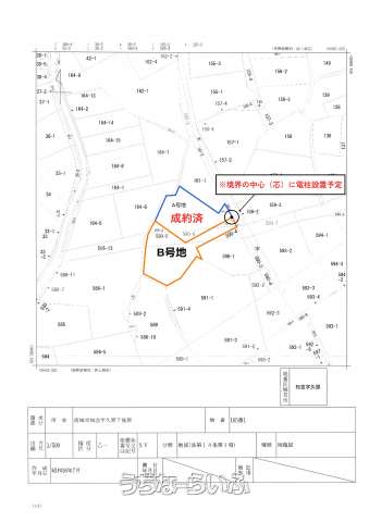 | 備考 | ※165-4:畑 165-3:畑 160-3:畑 590-5:雑種地 590-3:宅地 ※本物件には畑が含まれるため、農地法第3条・第5条の申請が必要です。 ※間口・隣地境界中央付近に電柱の設置を予定しております。 |