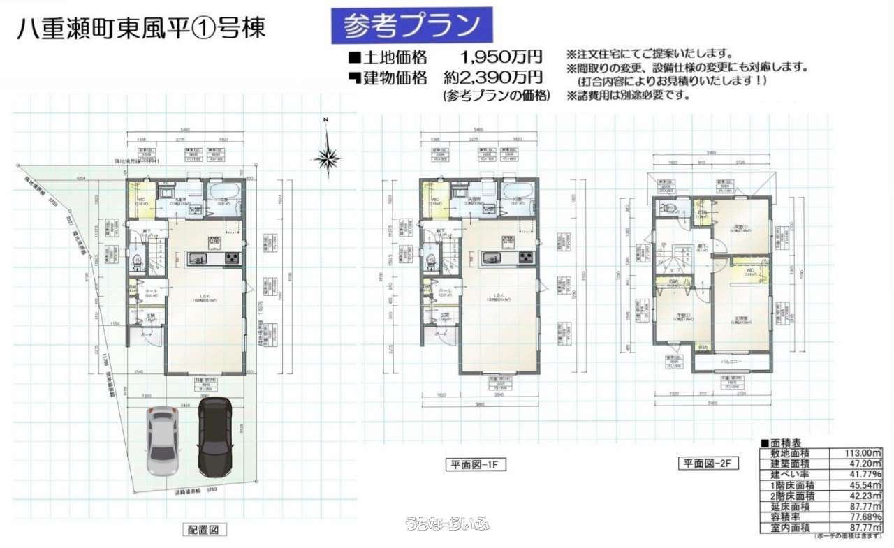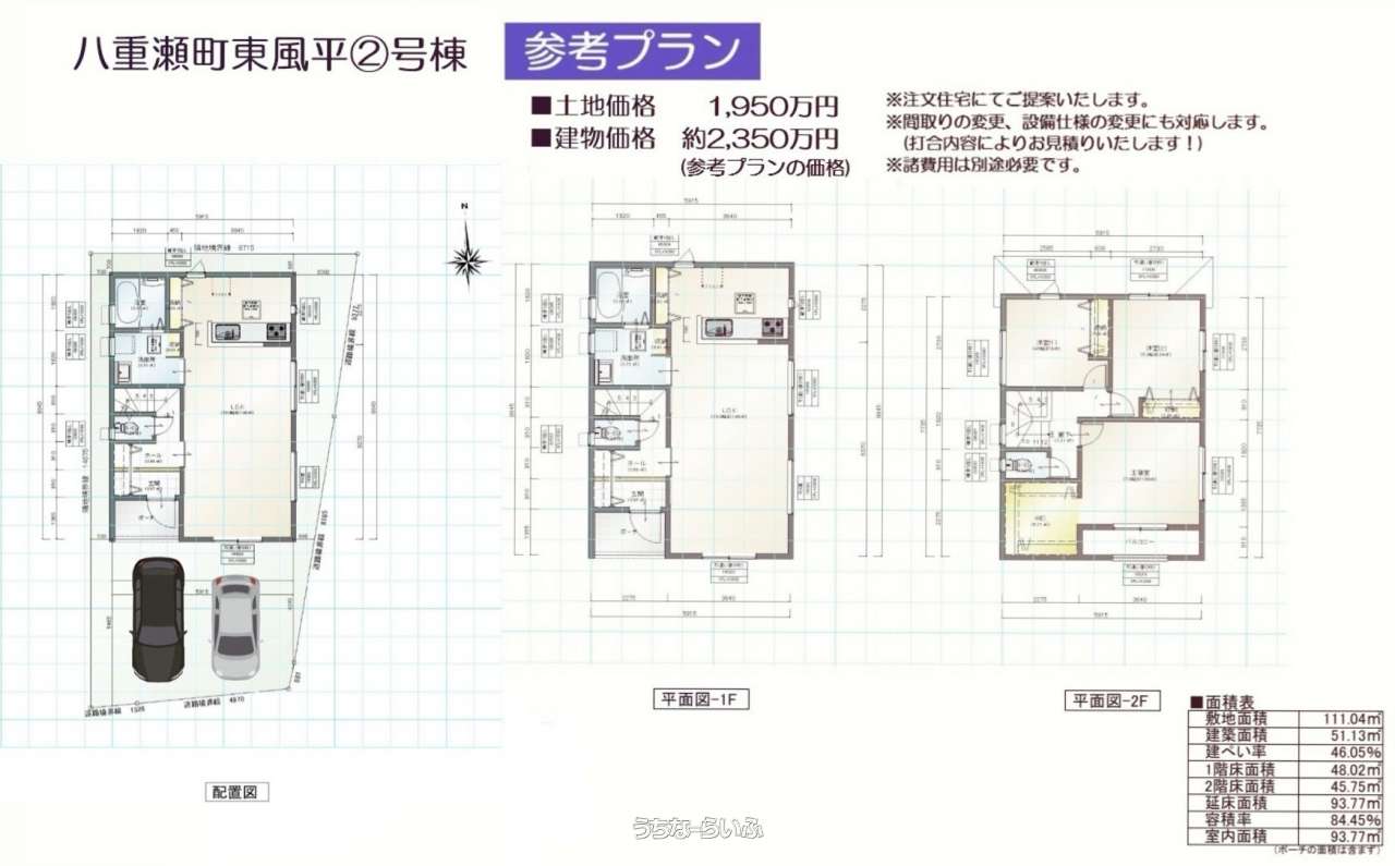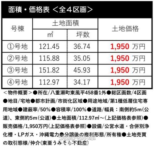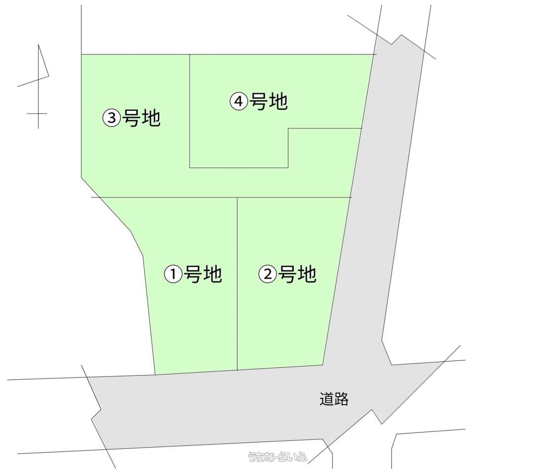 | 価格備考 | ①号地:36.74坪・1,950万円 ②号地:35.05坪・1,950万円 ③号地:45.93坪・1,950万円 ④号地:34.17坪・1,950万円 | ||