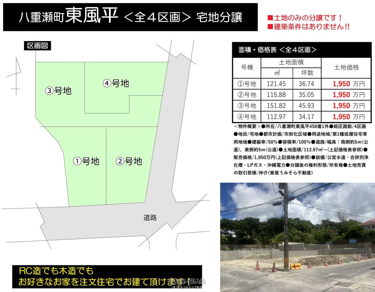 八重瀬町東風平<全4区画>④号地 ! 完成宅地の分譲地です。RCでも木造でも好きなお家がお建て頂けます! 東風平小学校近くの好立地です。②・③・④号地の参考プランも掲載してます!