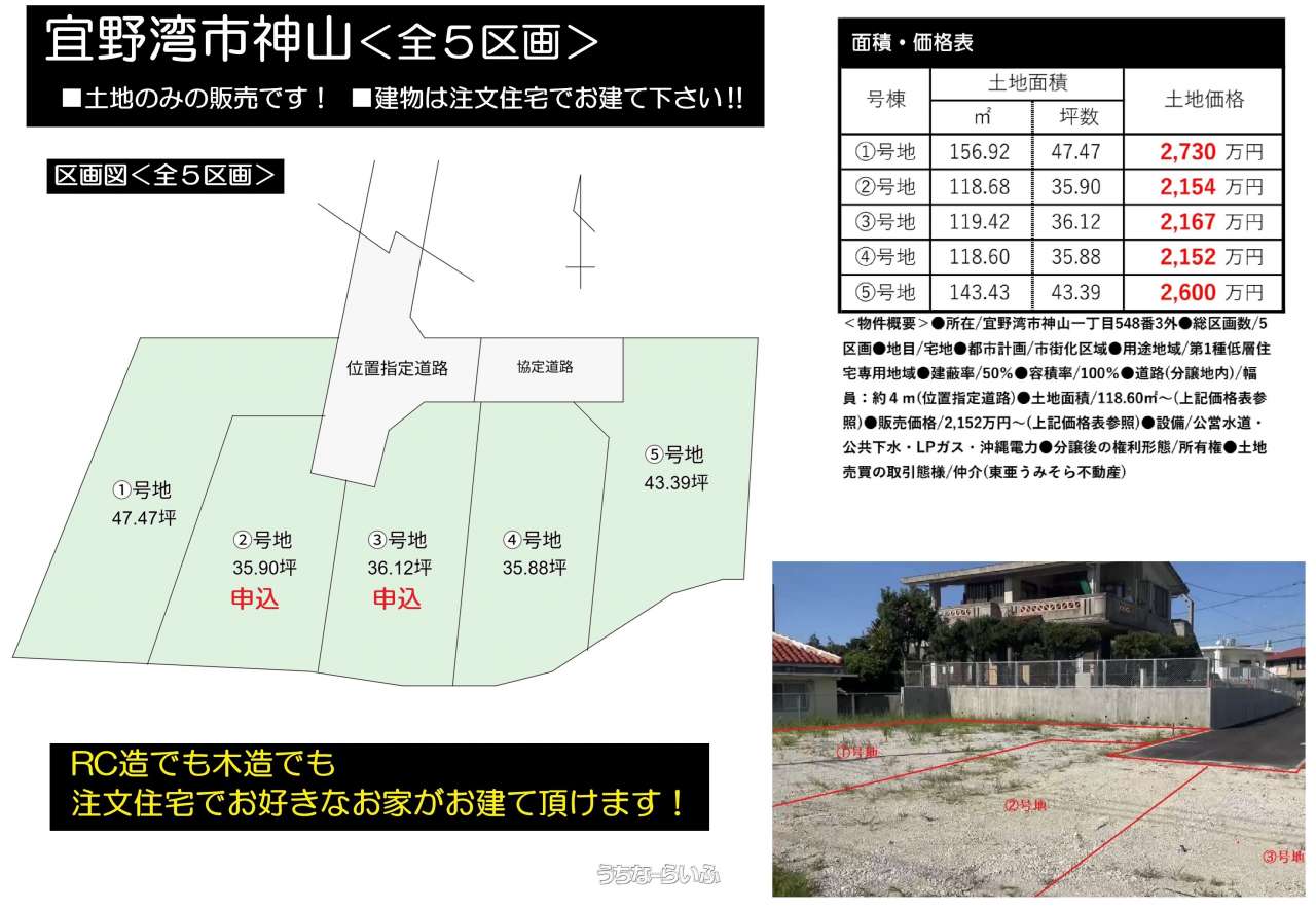 【宅地分譲】宜野湾市神山④号地ほか<全5区画> RCでも木造でも、注文住宅でお好きなお家をご提案(ご紹介)させて頂きます。それぞれ各区画の参考プラン(木造住宅)を添付してます。お気軽にお問合せ下さい!