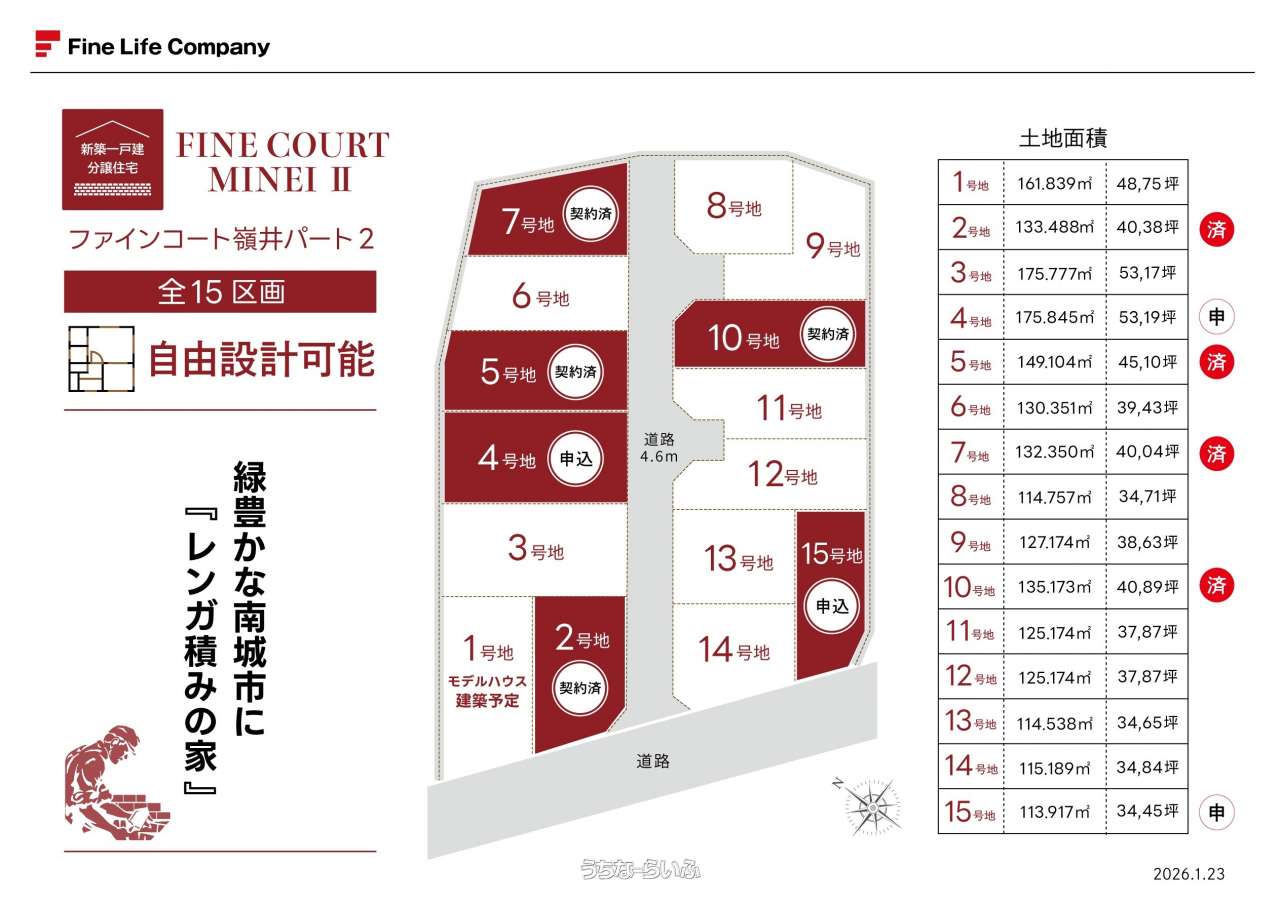 | 備考 | 【建築条件付き分譲地】全15区画 土地価格:1,213万~1,968万 レンガ積みの家(木造) 1号地モデルハウス:(161.83㎡・48.95坪) 2号地:成約済 3号地平屋用地:(175.77㎡・53.17坪) 4号地平屋用地:(175.84㎡・53.19坪) 5号地:成約済 6号地:(130.35㎡・39.43坪) 7号地:成約済 8号地:(114.75㎡・34.71坪) 9号地:(127.73㎡・38.63坪) 10号地:成約済 11号地:(125.17㎡・37.87坪) 12号地:(125.17㎡・37.87坪) 13号地:(114.53㎡・34.65坪) 14号地:115.189㎡・34.84坪) 15号地:申込中 【時を積む本物の住まい、100年先も美しい経年美化。 独自の構造で積む安心を実際に目で見て感じてみてください。】 弊社HPにて耐震・耐火実験の動画をご覧下さい。 https://finelife-ck.com/ |