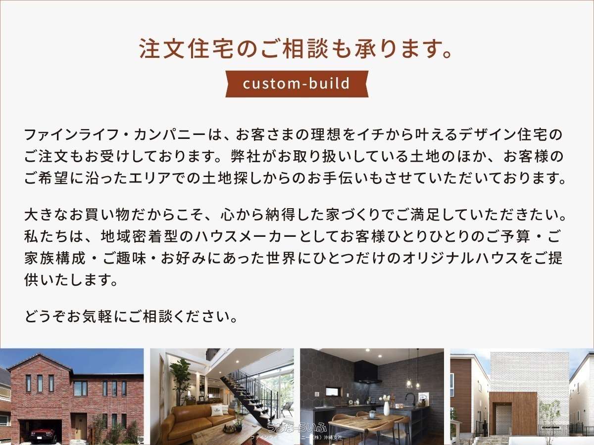 | 備考 | ファインコート嶺井 9号地【注文住宅用地】大里北小学校(徒歩5分)コストコ(車14分)静かで見晴らしの良い場所にレンガ積みの家!!!沖縄の環境に強くメンテナンスフリーの家!高級感がありオシャレな家!レンガ積みの家で積む家族の思い☆ 融資、間取り、その他ご相談だけでもお問合せお待ちしてます。 |