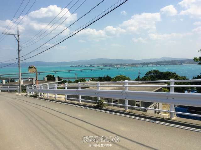高台の土地です。古宇利大橋・運天港入り口(コバルトブルー)内海・今帰仁の山々が一望に出来ます。人気観光地古宇利島別荘・カフェに最適。