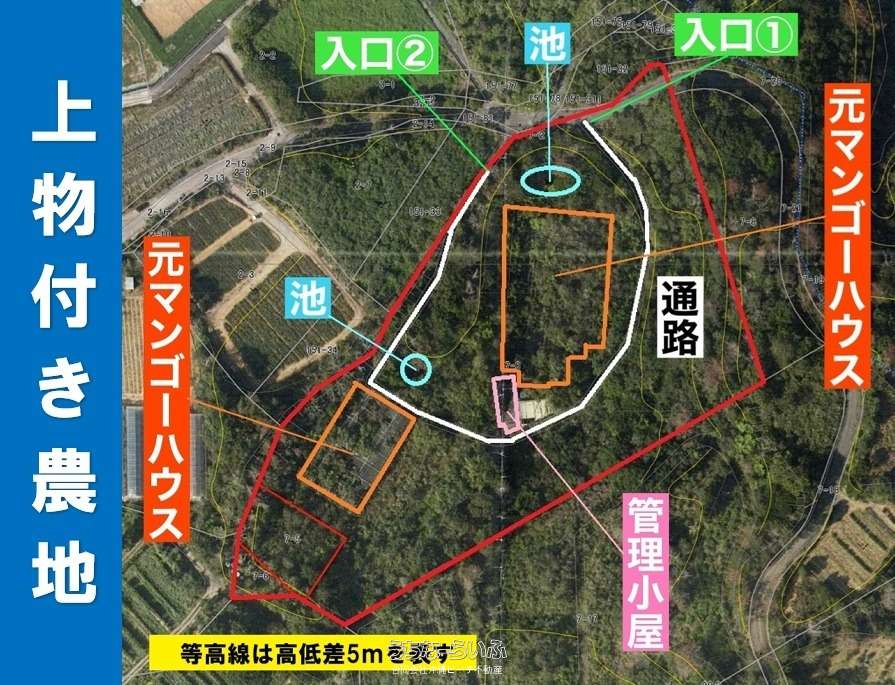 5093.19坪と広い敷地です!活用するためには草木・元マンゴーハウスの除去や管理小屋の修繕等、手入れが必要です。飲用水・農業用水は近隣未整備のため引き込みできませんが、かつては地下水を汲み上げて活用していたそうです。2箇所ある池をうまく活用できれば、散水用の水の足しになります。