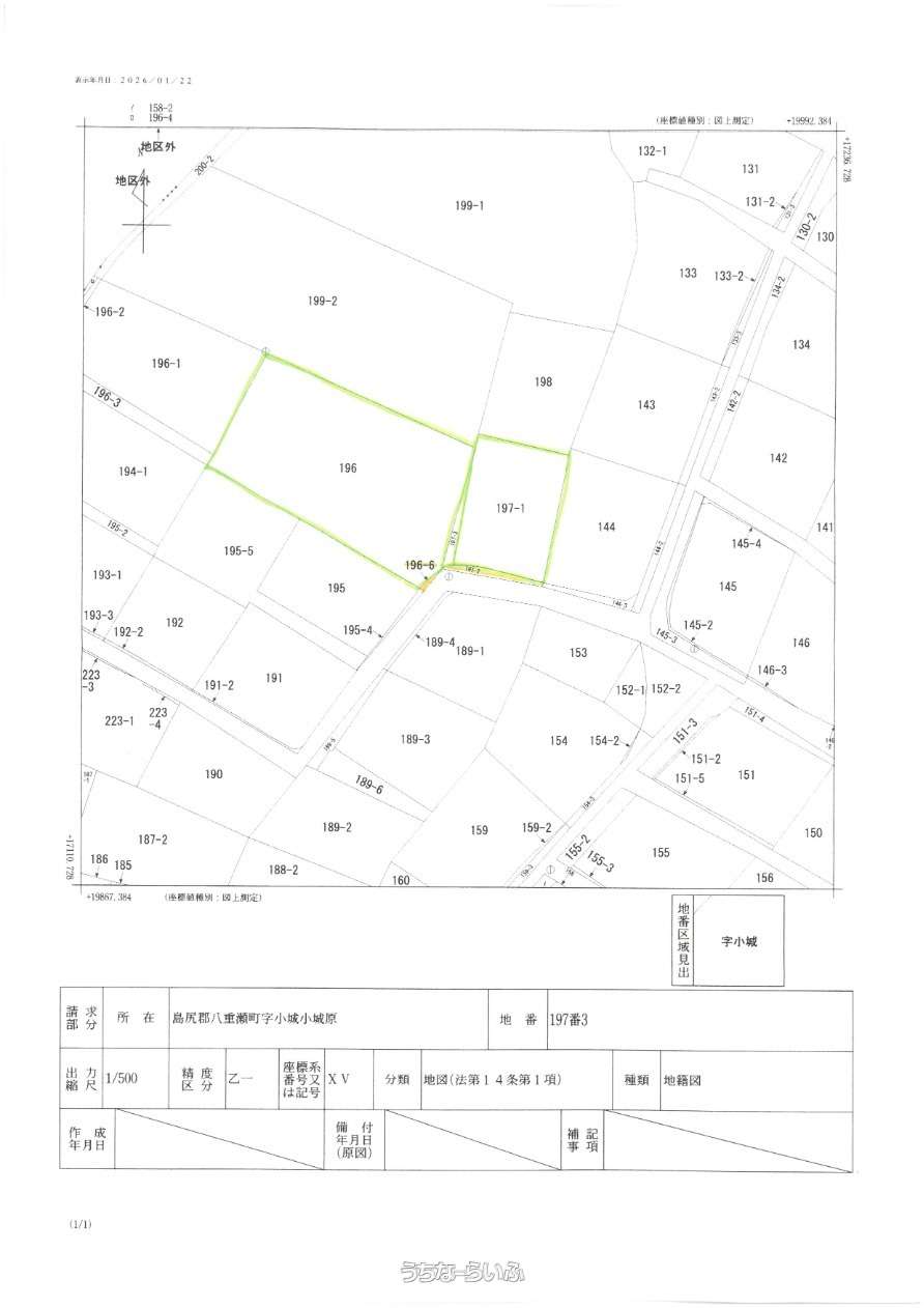 | 備考 | ・本物件は小城196、197-3、197-1の三筆をまとめた売出しになっております。 ・小城197-3、197-1は登記簿上の畑となっており、農地転用が必要になります。 |