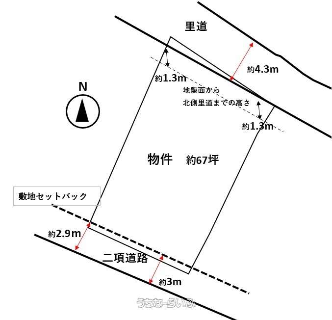 | 設備備考 | ※南道路が二項道路となっており、建築時にはセットバック(敷地後退)があります(約12㎡3.6坪程度) 建築有効面積は約61坪程度になる見通しです |