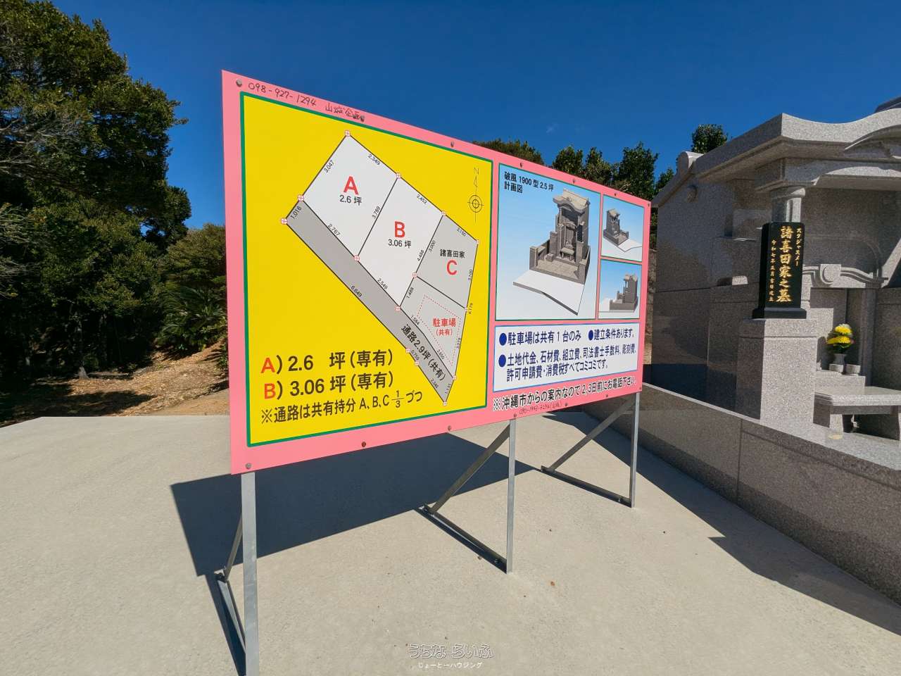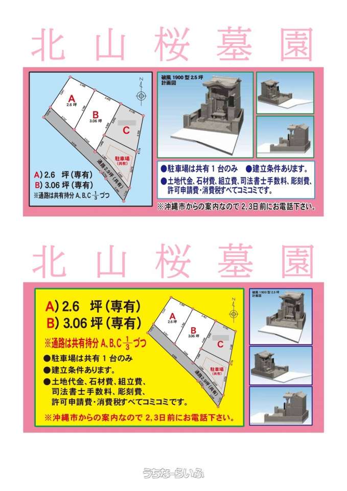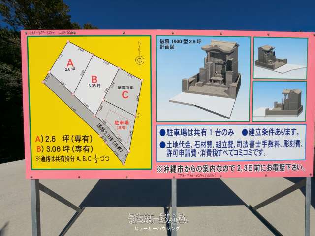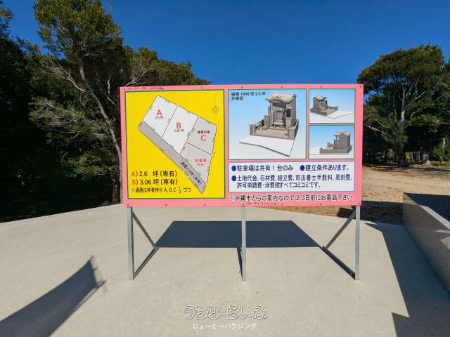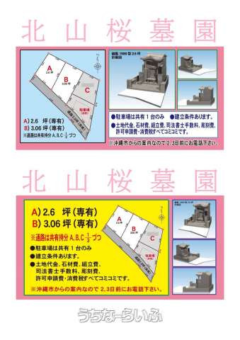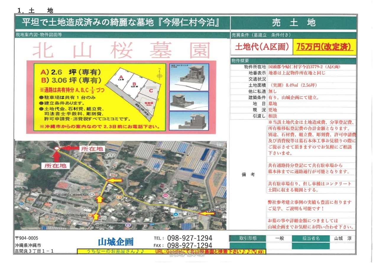 | 備考 | ✨遠方でやんばるまでお越し出来ないお客様へ沖縄市八重島にて複数実績がございますので、是非ご覧下さいませ✨ ※建立条件付き売買となり早くも残り2区画となります!! ※お墓造りのご相談も承ります♪♪ ☆条件交渉、価格交渉等で~じ頑張ります!お気軽にご連絡お問合せくださいませ。 詳しくは担当諸喜田(ショキタ)電話080-6489-0075まで宜しくお願いします(*^_^*) |